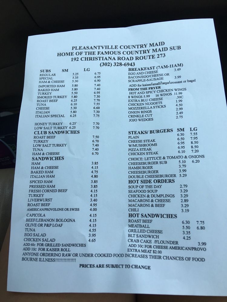 Country Maid Stores Menu
